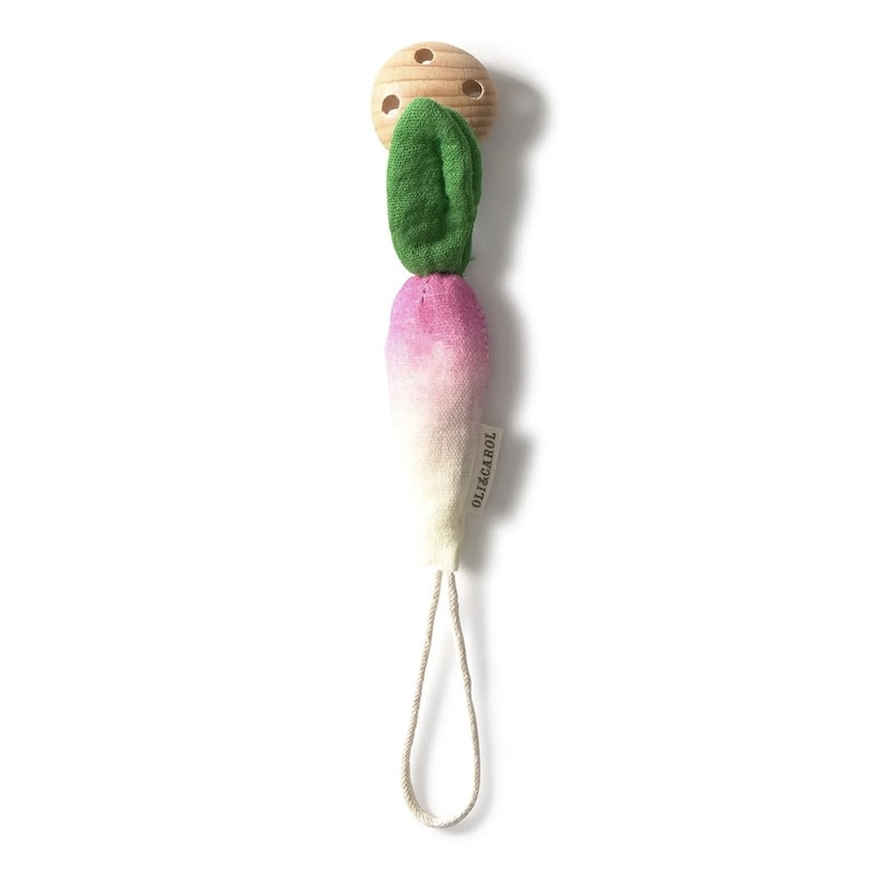 L'attache tétine, Ramona le radis, de Oli & Carol est fabriquée en coton biologique et rembourrée en fibres de maïs. L'accroche tétine est dotée d’un clip en bois de hêtre. Elle est pratique et facile à emporter partout.