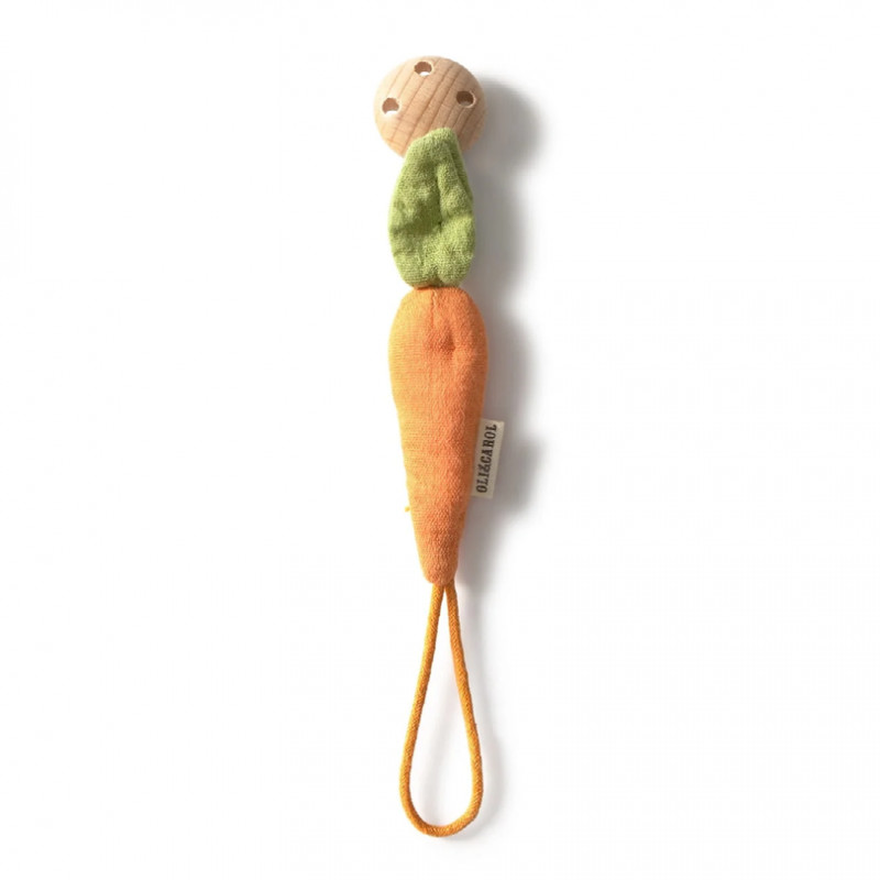 L'attache tétine, Cathy la carotte, de Oli & Carol est fabriquée en coton biologique et rembourrée en fibres de maïs. L'accroche tétine est dotée d’un clip en bois de hêtre. Elle est pratique et facile à emporter partout.