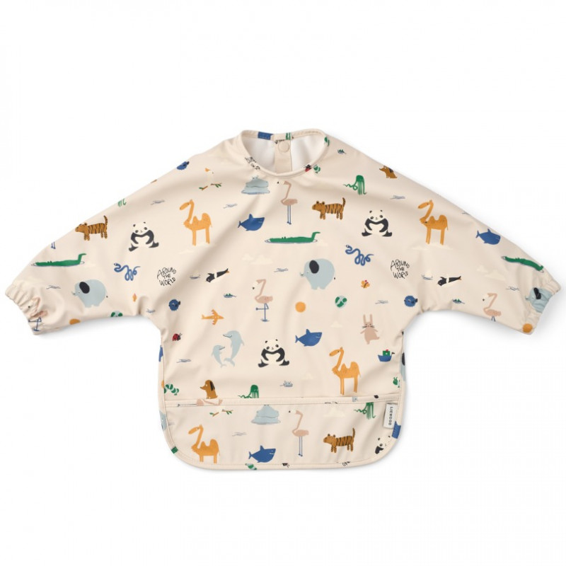Le bavoir à manches Merle Around the world, en polyester 100% recyclé de Liewood est idéal pour protéger les vêtements de votre enfant pendant les repas ou les activités créatives.