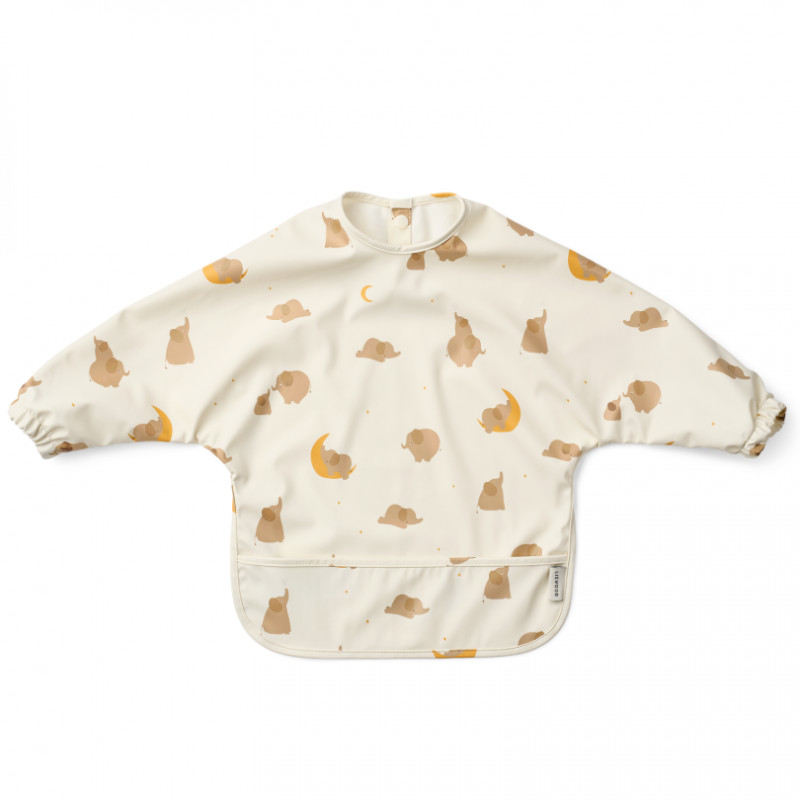 Le bavoir à manches Merle, Eléphant Crème de la crème, en 100% polyester recyclé de Liewood est idéal pour protéger les vêtements de votre enfant pendant les repas ou les activités créatives.