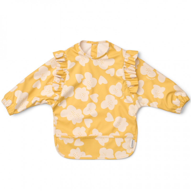 Le bavoir à volants à manches Ruffle Merle, Flower Lemon yellow, en 100% polyester recyclé de Liewood est idéal pour protéger les vêtements de votre enfant pendant les repas ou les activités créatives.