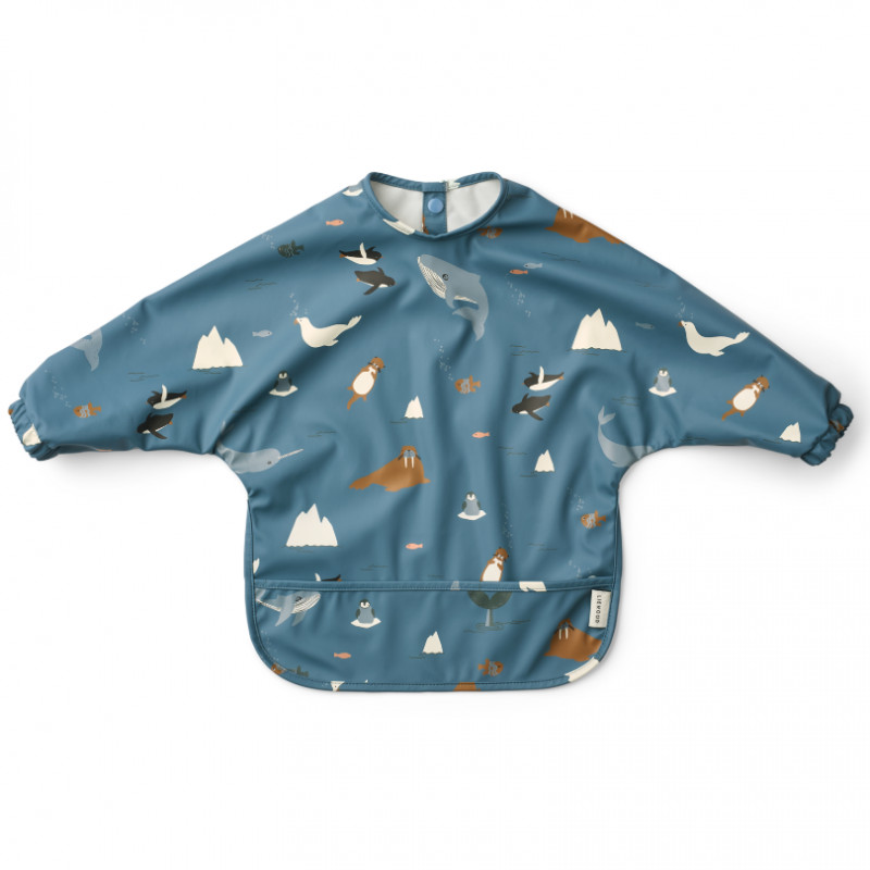 Le bavoir à manches Merle Artic sea ocean view, en polyester 100% recyclé de Liewood est idéal pour protéger les vêtements de votre enfant pendant les repas ou les activités créatives.