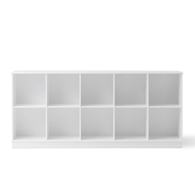 La bibliothèque 5 x 2 casiers horizontale, Collection Wood, est une étagère blanche avec un socle à poser au sol.