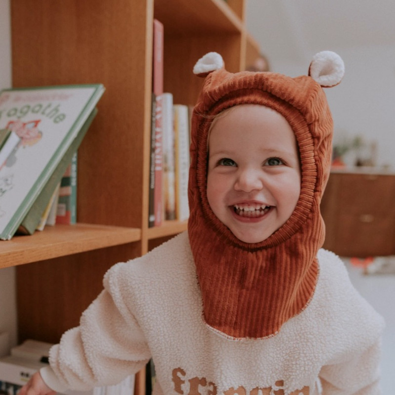 La cagoule polaire en velours, Paprika de Rien que des Bêtises, protégera bien la tête de votre bébé du froid et du vent.