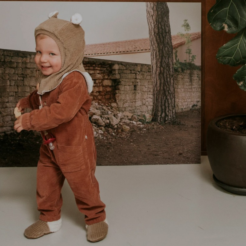 Le bonnet polaire en velours, Camel de Rien que des Bêtises, protégera bien la tête de votre bébé du froid et du vent.