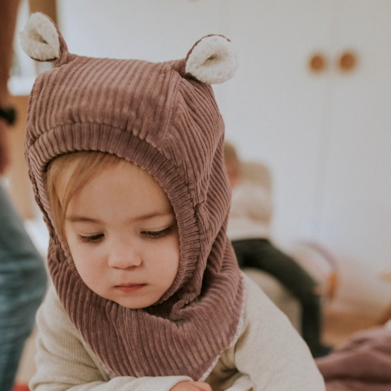 Le bonnet polaire en velours, Paprika de Rien que des Bêtises, protégera bien la tête de votre bébé du froid et du vent.