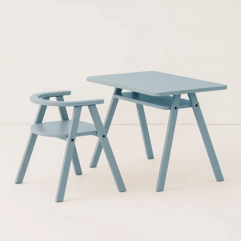 L'ensemble bureau et chaise enfant Growing green, en bois de hêtre massif et contreplaqué, coloris Baltic blue de Nobodinoz a été conçu en collaboration avec le designer Marc Venot.