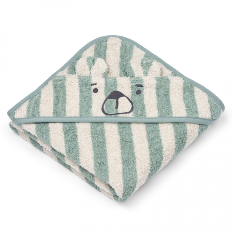 La cape de bain à rayures Albert, Ours Peppermint de Liewood est une cape de bain moelleuse en coton bio.