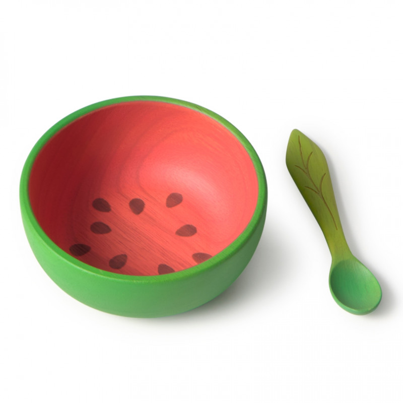 Le coffret repas en bois hévéa, Wally la pastèque de Oli & Carol est composé d’un bol et d’une cuillère fabriquées à la main en bois d’hévéa.