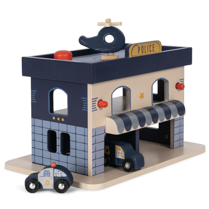 Ce jouet en bois, Station de police, présente des détails soignés et une construction solide.