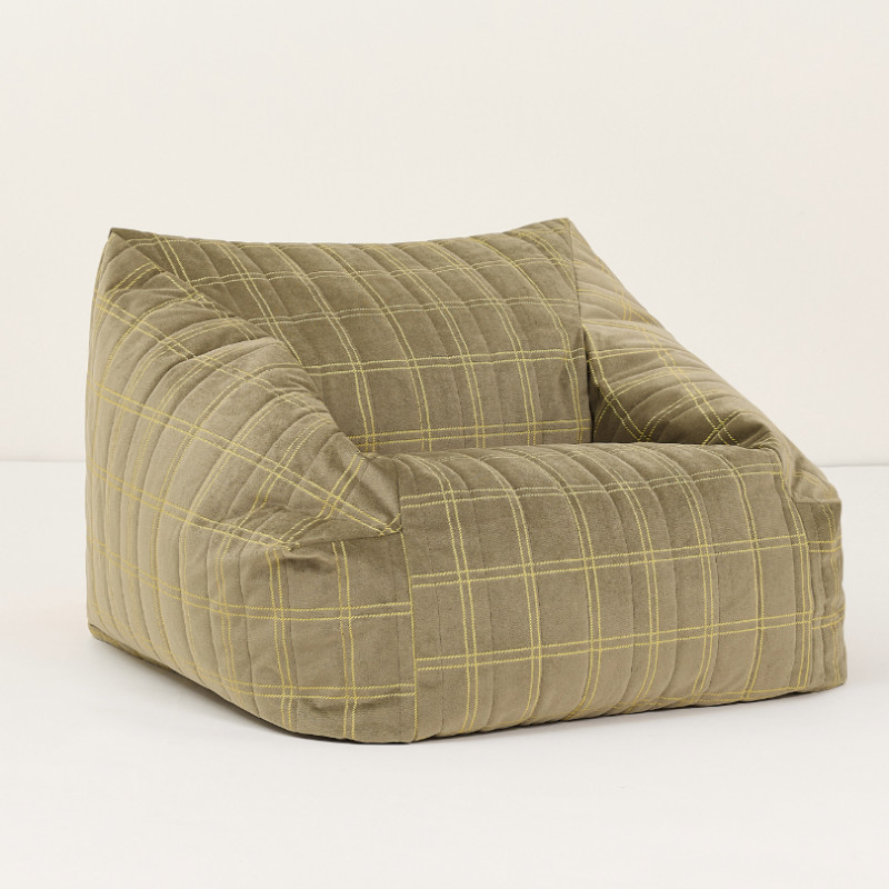 Les petits comme les grands enfants vont adorer s’assoir sur le pouf fauteuil Chelsea Eco-Velours, en grey blue windowpane de la marque espagnole Nobodinoz. En 100 % polyester recyclé et rempli de billes de polystyrène, il est à la fois solide et confortable.
