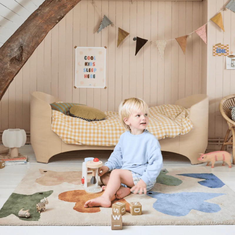 Le tapis tufté en coton bio, Marin kaki de chez Bleuu-Studio est un tapis enfant doux, moelleux et robuste. Il trouvera naturellement sa place dans la chambre de votre enfant.